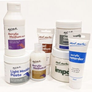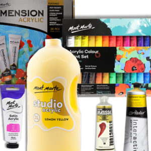 - Acrylics: Our range offers a vast selection of colours from trusted brands– Atelier Interactive, Chromacryl, Matisse Structure, and Mont Marte Dimension, Satin and Signature acrylics. These premium products provide fast-drying coverage with a creamy, semi-matte finish. You can use acrylic paints on almost any surface, including wood, leather, and certain plastics.