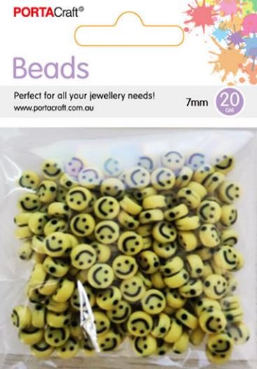 Beads 7mm 20g Discs Yellow w Black Smiley Faces
