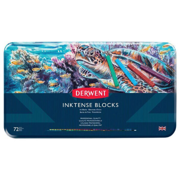 Derwent Inktense Blocks Tin includes 72 highly-pigmented ink blocks. They are incredibly versatile and can be used in a variety of ways to create different effects. Apply them dry for a rich, opaque colour or add water to create a transparent ink.