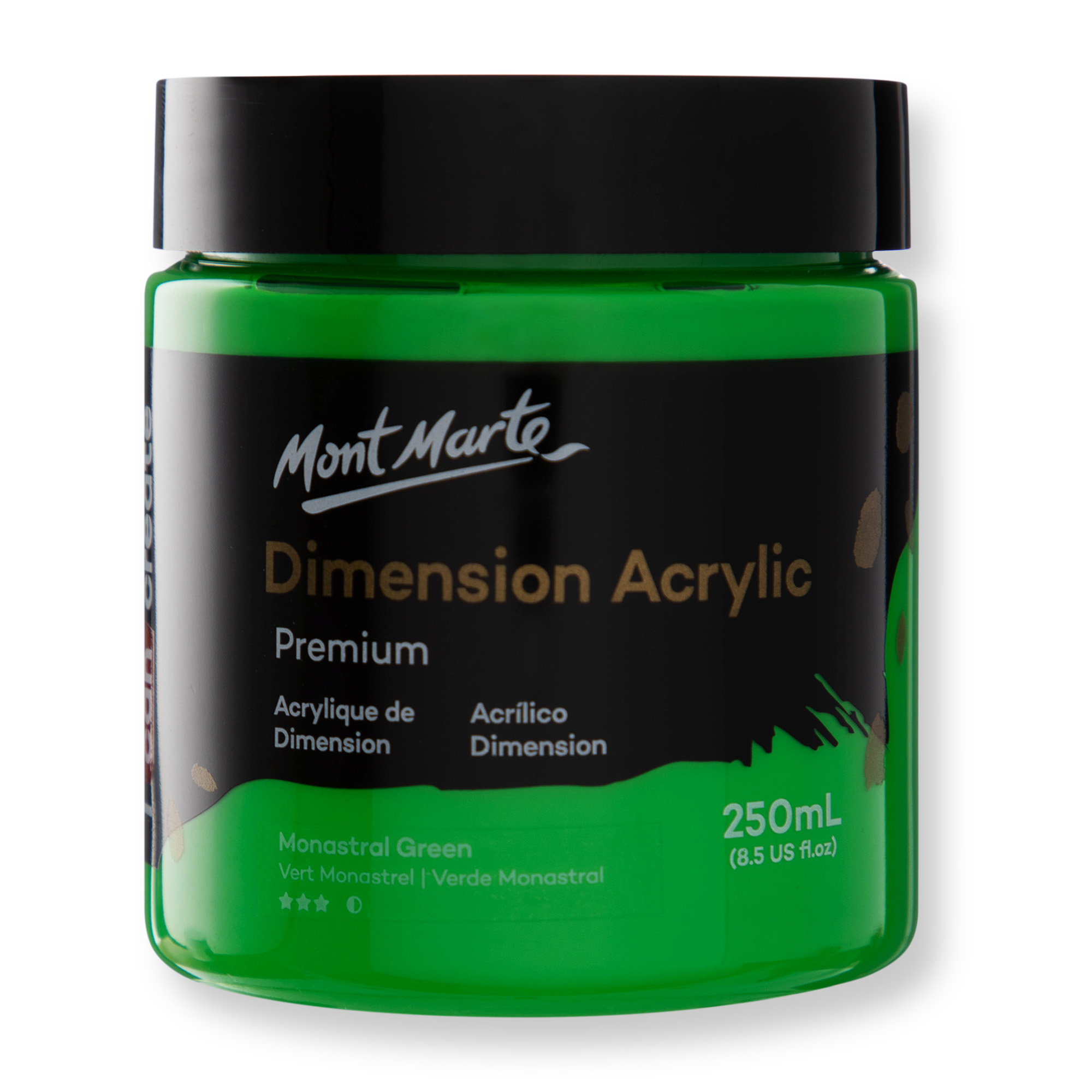 Mont Marte Dimension acrylic is a high viscosity fine art paint that offers artists a new dimension in painting. This acrylic's ultra thick consistency can be applied with brush, palette knife or shaper to create especially exaggerated texture effects. Dries hard and holds shape while still maintaining flexibility and smooth flowability. It can be diluted with water or acrylic mediums for glazing or watercolour techniques. With dilution, the pigment still holds strong colour intensity. Excellent lightfastness and premium quality pigment means colour strength will stay brilliant for longer. The DIMENSION series is available in a range of vivid colours which dry to a radiant gloss finish.