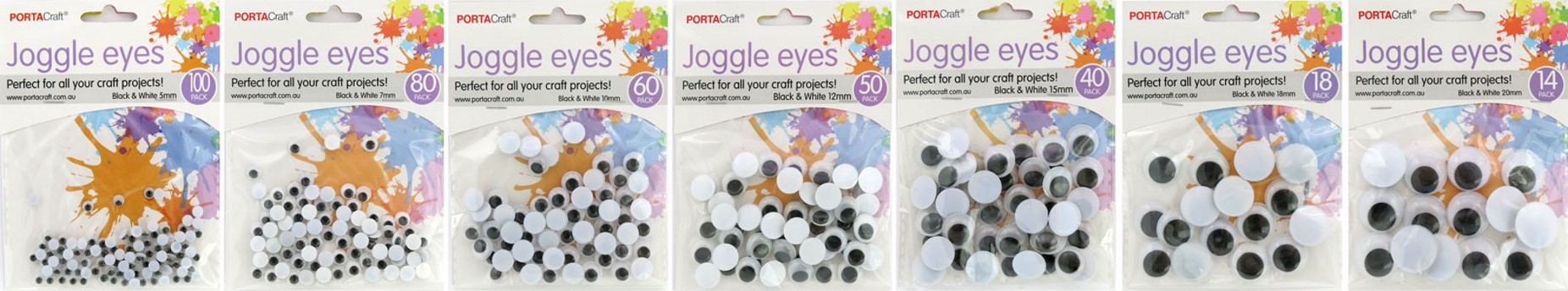 Portacraft Joggle Eyes is a great addition to any craft, kids will love making characters with them. Adding Joggle eyes adds a fun extra 3D look to your artwork you can make eyes for people, pets, fun characters the limit is up to you. The eyes can be glued onto felt, fabric, calico, paper cardboard and more.