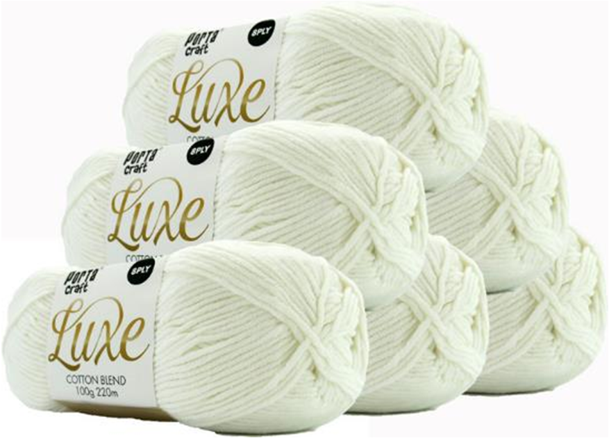 Luxe Yarn is a cotton blend perfect for luxurious yarn creations. It consists of 60% cotton and 40% acrylic yarn.