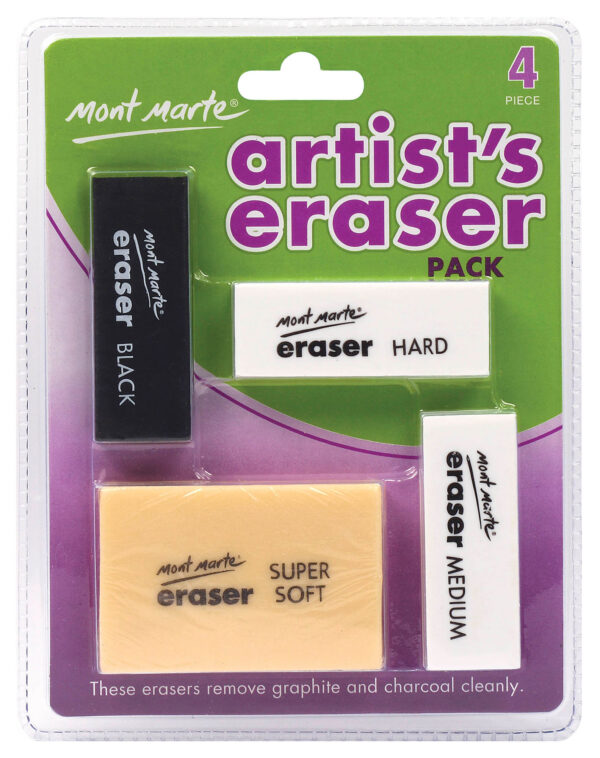 The Mont Marte Creative Eraser Set contains 4 erasers for all your artistic needs. The jumbo super soft eraser is great for large drawings and can be used to lift off highlights with charcoal or graphite. The hard eraser is perfect for harder surfaces such as tracing paper. The medium eraser is ideal for more delicate papers where abrading may be an issue. The black eraser is excellent when used on black paper and will not leave marks that white erasers have a tendency to leave.