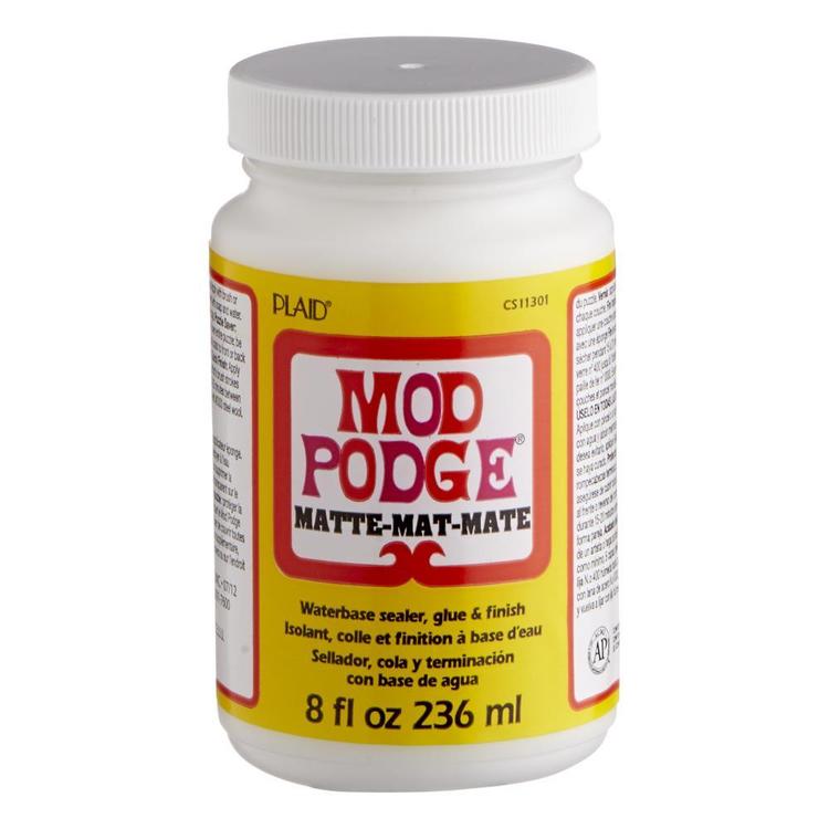 Mod Podge, available in both a gloss and a matte finish, is a milky white liquid that dries transparent in less than 10 minutes.