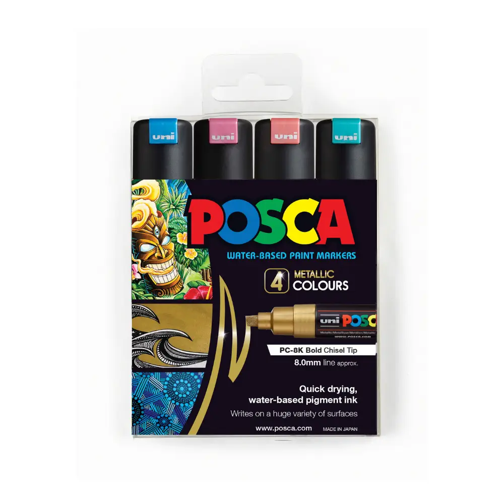 POSCA MARKERS BOLD CHISEL PC8K 8.0MM METALLIC COLOURS 4 PACK ASSORTED SET