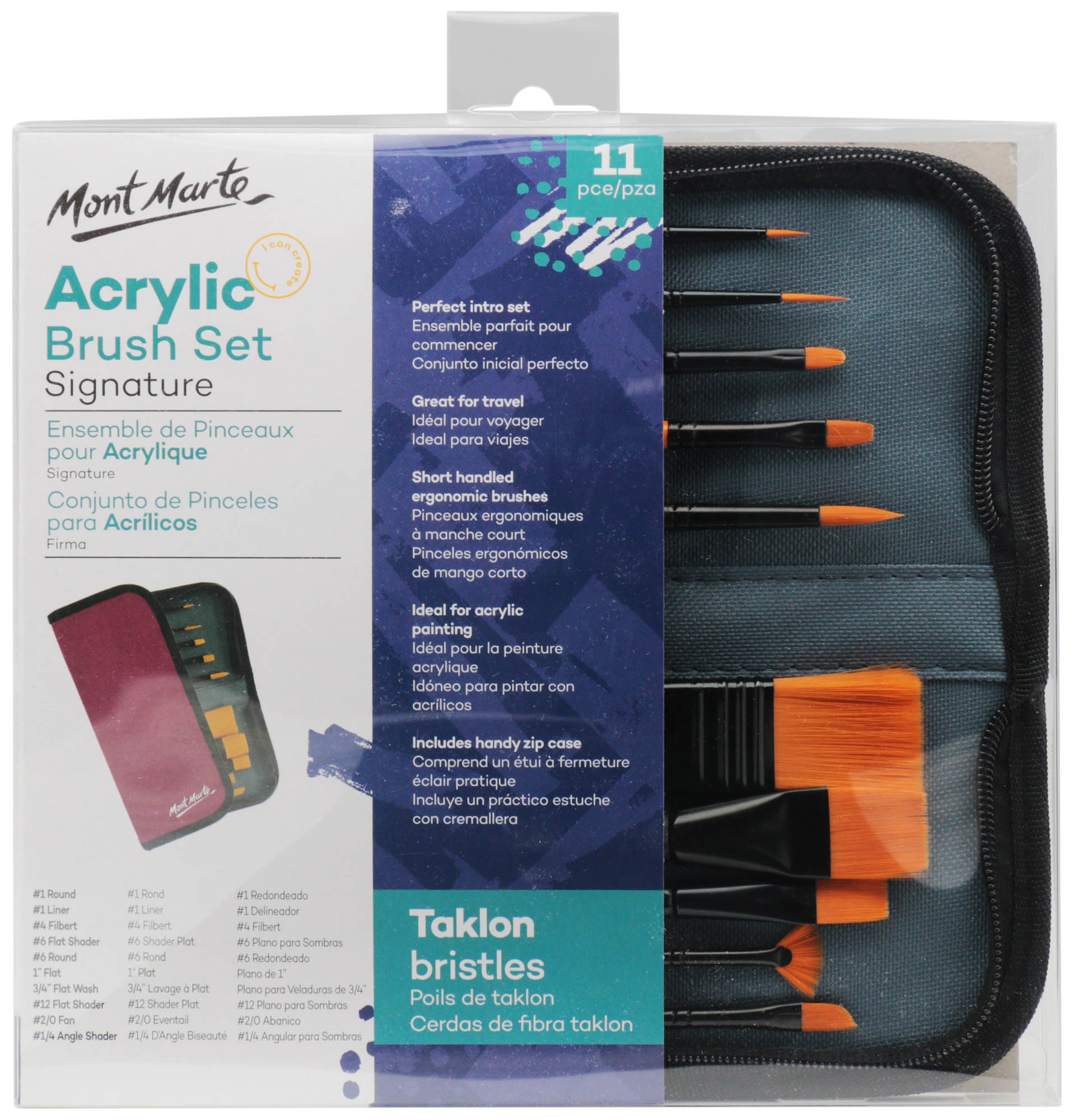 The Mont Marte Acrylic Brush Set is a beautiful selection of taklon bristled brushes ideal for acrylic projects. The handy zip case is perfect for travel and helps to extend the life of your brushes.