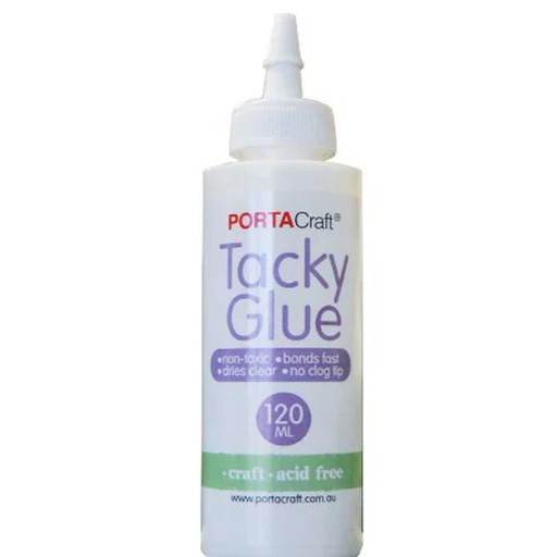 Porta Craft Tacky Glue, is easy to use. Ideal craft and hobbies. Make Sure Surface is Clean and dry. Cut the tip and replace cap to close. For use with Paper, Fabric, etc apply a thin coat, press together until dry. For use with wood, Pottery, Etc apply a thin coat, clamp or weight together until dry. use water to wipe up excess glue before it dries.